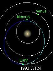 Она представляет собой эллипс, располагающийся между орбитами Меркурия и Земли. Период обращения астероида равен 222 дням. Периодически он пролетает мимо трех планет - Меркурия, Венеры и Земли. Иногда такое происходит в течение одного года. Каждая из этих планет при сближении с астероидом своим гравитационным полем несколько меняет его орбиту. Во всяком случае, за долгую историю существования 1998 WT24 его орбита существенно изменилась. Астрономы полагают, что раньше его орбита располагалась в астроидном поясе между Марсом и Юпитером, и изменилась она как раз в результате гравитационного взаимодействия с Юпитером и Марсом, а затем и с Землей. Вот почему астрономы и не спешат вычеркивать его из списка потенциально опасных астероидов.