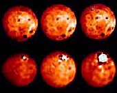 В феврале 2001 г. установленный на Гавайях 10-метровый телескоп Keck II с адаптивно-оптической системой вел наблюдение за Ио - одним из четырех крупных спутников Юпитера. Это самый вулканически активный объект в нашей солнечной системе, и на этот раз он полностью подтвердил свою репутацию. В течение трех дней, начиная с 20 февраля, на Ио извержение вулкана прошло все стадии от начала и до своего пика. Самое начало извержения показано на снимках в верхнем ряду. Через два дня извержение заметно усилилось и стало самым ярким из тех, что удалось зафиксировать за все время наблюдений.