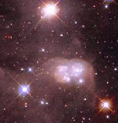 На этом снимке телескоп Hubble запечатлел флуоресцирующее свечение водорода и серы, образующее "двойной пузырь", а также яркие горячие звезды. Над "двойным пузырем" видна очень яркая звезда, которая называется Henize S22. Она освещает пузырь из пыли как фонарик освещает облако дыма. Эта звезда находится на расстоянии всего лишь 25 световых лет от туманности N30B. И для обитателей этой туманности (если таковые существуют) эта звезда светит в 250 раз ярче, чем Венера на нашем небосклоне.