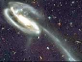 Hа переднем плане виды две сталкивающиеся галактики, которые находятся на расстоянии 420 млн световых лет от нас. Оставшийся он этого столкновения хвост звезд и газа протянулся на расстояние 280 тыс. световых лет. В общей сложности в кадр попало около 6 тысяч едва различимых галактик и их фрагментов, которые находятся на самых разных этапах своей эволюции.