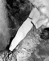 Европейский спутник Envisat стал свидетелем последних дней существования самого большого в мире айсберга B-15A в море Росса около берегов Антарктиды. Раньше его длина составляла 160 км, но после недавнего шторма он раскололся на две части. На представленном здесь снимке четко видны довольно широкие трещины между двумя теперь уже отдельными айсбергами.