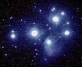 Молодое рассеянное звездное скопление Плеяды, которое находится в созвездии Тельца на расстоянии около 400 световых лет от Земли, видно невооруженным глазом. Точнее невооруженным глазом видны семь его самых ярких звезд. А всего в Плеядах насчитывается более 500 звезд, возраст которых составляет порядка 100 млн лет.