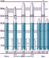 От "базовой" модели (крайняя слева) ракеты Delta 4 ее тяжелая версия (крайняя справа) отличается весьма разительно. Фактически - это три базовых ракеты Delta 4, собранных вместе, и к ним еще добавлен разгонный блок.