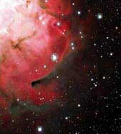 Это фрагмент туманности "Трехраздельная" (Trifid), которая находится в созвездии Стрельца. Официальные ее наименования в каталогах: М 20 и NGC 6514. По оценкам астрономов, расстояние до "Трехраздельной" туманности составляет около 9 тысяч световых лет. В центре нее находится звезда, которая в несколько раз тяжелее нашего Солнца. Ультрафиолетовое излучение этой звезды ионизирует окружающий ее газ и разогревает облака межзвездной пыли.