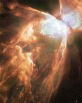 Это фотография центральной части туманности Жука (Bug Nebula), которая в каталоге фигурирует под официальным названием NGC 6302. Этот снимок был сделан космическим телескопом Hubble. Туманность Жука является одной из самых ярких из известных планетарных туманностей. В ее центре находится очень горячая умирающая звезда, которая выбрасывает в окружающее пространство свои внешние слои. Ее температура составляет как минимум 250 тыс. градусов С. Эта звезда излучает главным образом в ультрафиолетовом диапазоне длин волн, поэтому на снимке телескопа Hubble, работающем в оптическом диапазоне, ее не видно за яркими облаками газа и пыли.