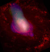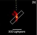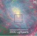 А это фотография центральной части той же галактики (длина белой черты соответствует 300 световым годам) в дальнем инфракрасном диапазоне длин волн (8,7 мкм), сделанная наземным телескопом VLTI. Здесь видна структура центрального облака пыли. Его спектральные исследования показали, что черную дыру окружает тороидальное по форме облако пыли, температура которой во внутренней зоне диаметром около 2 световых лет достигает 500 градусов С, а во внешней, имеющей размер 11 световых лет в поперечнике и толщиной 7 световых лет, она составляет около 50 градусов С. Удалось определить и возможный состав частиц пыли. В них присутствует алюминий и кремний в форме алюмосиликата Ca2Al2SiO7, который встречается в верхних слоях атмосферы некоторых звезд-супергигантов.