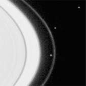 А эта фотография была сделана Cassini 1 мая с расстояния 31,4 млн км от Сатурна. Здесь в кадре снова оказались Прометей и Пандора. Но теперь Прометей обгоняет Пандору при их движении вокруг Сатурна (такой обгон происходит каждые 23 дней). Кроме этой пары в кадр попал еще один спутник Сатурна - Эпиметей (в правом верхнем углу фотографии). Он немного побольше Прометея, его размер в поперечнике составляет 116 км.