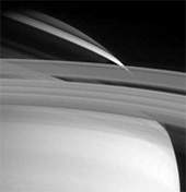 Исследовательский зонд Cassini сейчас приближается к Сатурну. На орбиту этой планеты он должен выйти 1 июля 2004 г. Представленный здесь снимок - это фрагмент фотографии Сатурна, сделанной узкоугольной камерой зонда Cassini в видимом диапазоне длин волн 10 мая с расстояния 27,2 млн км. После того как снимок был обработан для усиления контрастности изображения, стала видна нитевидная структура теней, отбрасываемых кольцами Сатурна на плотные слои атмосферы северного полушария планеты. Здесь можно различить широкое полупрозрачное С-кольцо Сатурна и самое внешнее очень тонкое F-кольцо, ширина которого составляет несколько километров.