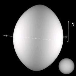 Если Солнце делает полный виток вокруг своей оси примерно за 24 часа и его экваториальная скорость составляет около 7200 км/ч, то у Регула экваториальная скорость составляет порядка 1,1 млн км/ч. При этом ее диаметр почти в 5 раз больше, чем у Солнца. Из-за такого быстрого вращения форма звезды заметно отличается от шара: ее экваториальный диаметр на треть больше полярного (на представленном здесь рисунке в масштабе изображены Регул и Солнце). Причем, если бы звезда Регул вращалась бы еще на 10% быстрее, то ее центробежная сила превысила бы гравитационную, и внешние части звезды разлетелись бы по сторонам.