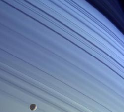 Иллюстрацией сказанного может быть вот эта фотография, сделанная в январе 2005 г. На переднем плане здесь виден спутник Сатурна Мимас, а узкие полосы по диагонали на голубом фоне - это тени конец Сатурна на его атмосфере. То есть небо Сатурна имеет голубой цвет. И это действительно так, хотя, если посмотреть на Сатурн с Земли в любительский телескоп, то его доминирующим цветом будет желтый. Такой цвет придает ему солнечное излучение, отраженное внешним толстым слоем облаков. Зонд Cassini подлетел к Сатурну на существенно более близкое расстояние, и его камере удалось сфотографировать чистый "воздух" над облаками Сатурна. Цвет этого "воздуха" как раз голубой.