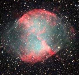 Планетарная туманность Гантель (Dumbbell Nebula), которая в каталоге имеет официальное название M27, находится в нашей галактике Млечный Путь в созвездии Лисичек на расстоянии около 1200 световых лет от Земли. Открыта она была еще в 1764 г. французским астрономом Шарлем Мессье (Charles Messier), он и занес ее в свой каталог туманностей под номером 27. Хотя туманность и называется Гантель, на представленном здесь снимке она похожа не на гантель, а на помятую сферу. Этот снимок сделан мощным телескопом обсерватории Kitt Peak в Аризоне, но если взглянуть на эту туманность в небольшой любительский телескоп, то по форме она будет напоминать как раз гантель или наполовину обкусанное яблоко, поэтому она и получила такое название.