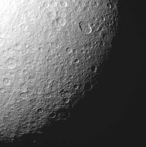 Этот снимок южной приполярной области Реи был сделан зондом Cassini в июле этого года с расстояния около 239 тыс. км во время облета этого спутника. После этой съемки стало ясно, что южный полюс, так же как и остальная поверхность Реи, сильно побит многочисленными астероидами и метеоритами. Причем, правило, что "бомба в одну и ту же воронку дважды не падает", здесь не работало. Внутри крупных кратеров видны более мелкие, а следы одних кратеров накладываются на другие. Самый большой такой "составной" кратер эллиптической формы виден в верхней части снимка: его размеры - 115 на 91 км.