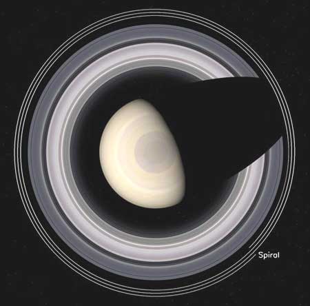 Проведя исследования всех существующих снимков кольца F и его фрагментов, группа астрономов под руководством Себастьяна Шарно (Sebastien Charnoz) из Парижского университета пришла к довольно необычному выводу. Их статья, посвященная кольцу F, опубликована в номере журнала Science от 25 ноября 2005 г. Они считают, что кольцо F на самом деле представляет собой спираль (см. рисунок вверху) и что боковые полосы этого кольца, которые изначально интерпретировались как концентрические кольцевые сегменты, в действительности связаны между собой и образуют единую спираль, которая делает как минимум три витка вокруг Сатурна.