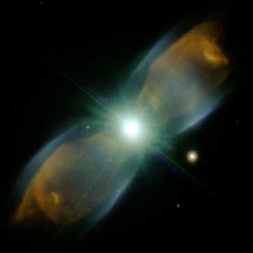 Это - планетарная туманность M2-9, которая находится на расстоянии 2100 световых лет от Земли. Снимок был сделан с помощью гавайского телескопа Gemini North с адаптивно-оптической системой Altair, благодаря которой астрономы увидели многие ранее неизвестные подробности туманности M2-9. M2-9 - это туманность, которая появилась в результате взрыва звезды. В ее центре находится та самая умирающая звезда, а вокруг этой звезды можно увидеть разлетающиеся в стороны потоки газа, выброшенные при взрыве. В данном случае эти газовые выбросы имеют довольно аккуратную симметричную форму.
