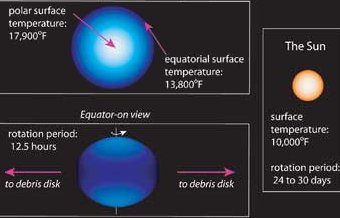 Вега - самая яркая звезда созвездия Лиры и пятая по яркости из всех, видимых с Земли. Она расположена всего в 25 световых годах от Солнца, и потому относится к немногочисленным телам, точки поверхности которых можно отличить друг от друга средствами радиоастрономии. Ученых она интересует также потому, что вблизи нее расположен газовопылевой диск, отдаленно напоминающий тот, который окружал Солнце до образования планет. Поскольку теперь природа излучения Веги стала понятнее, астрономы надеются уточнить сведения о нем, сравнивая теоретический и видимый спектры - по тому, какие лучи он поглощает, можно судить о составе и плотности газа и пыли.