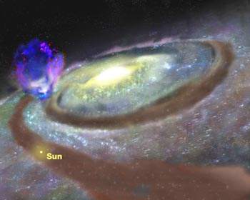 Группа астрономов, работавших на радиотелескопе Green Bank Telescope (GBT), объявили об открытии огромного облака водорода, которое "выдувается" из плоскости нашей галактики. Этот "суперпузырь" уже поднялся над плоскостью Млечного Пути на высоту около 10 тыс. световых лет. Схема этого явления показана на представленном рисунке, где также указано местоположение нашего Солнца относительно этого пузыря (он изображен в синих и малиновых цветах).