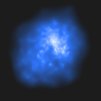 Этот аморфный голубой пузырь на самом деле является изображением галактики NGC 7618 в рентгеновском диапазоне длин волн. Снимок был сделан рентгеновским космическим телескопом Chandra. По этой фотографии сложно догадаться, что в видимом диапазоне длин волн галактика NGC 7618 имеет эллипсоидальную форму и относится к классу эллиптических галактик. Астрономы были немало удивлены, обнаружив существенные различия в видимом и рентгеновском изображениях одной и той же галактики. Как оказалось, мощные источники рентгеновского излучения в этой галактике никак не коррелируются с ее формой в видимом диапазоне длин волн. Обычно в эллиптических галактиках содержится мало холодного газа и пыли, в них мало массивных молодых звезд, которые могут взрываться как сверхновые, и вообще, астрономы всегда считали, что эллиптические галактики - это относительно спокойные объекты, для которых нехарактерна бурная активность. Однако рентгеновские снимки эллиптической галактики NGC 7618 указывают на то, что в ней есть примерно раз в 100 млн лет "включается" какой-то мощный источник энергии, который возбуждает окружающий газ. Возможно, там все-таки происходят взрывы сверхновых.