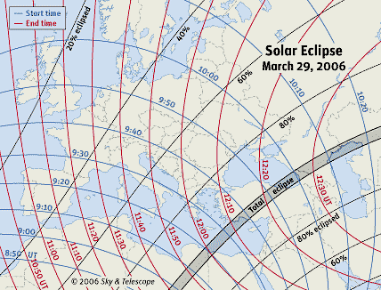 Сегодня 29 марта 2006 г. в некоторых районах земного шара будет наблюдаться полное солнечное затмение: Луна пройдет между Землей и Солнцем и на время полностью заслонит Солнце для обитателей ряда территорий. Солнечное затмение пройдет довольно узкой полосой, которая пересечет Атлантический океан, Африку, Турцию, Кавказ, Астраханскую область и Алтайский край. Схема прохождения показана вверху, полное затмение будет наблюдаться только в пределах серой полосы обозначенной "PATH OF TOTALITY", а по сторонам от нее затмение будет частичным (доля закрытого Солнца в других регионах указана в процентах). Более подробная карта затмения на территории северной Африки, Турции и России показана ниже.